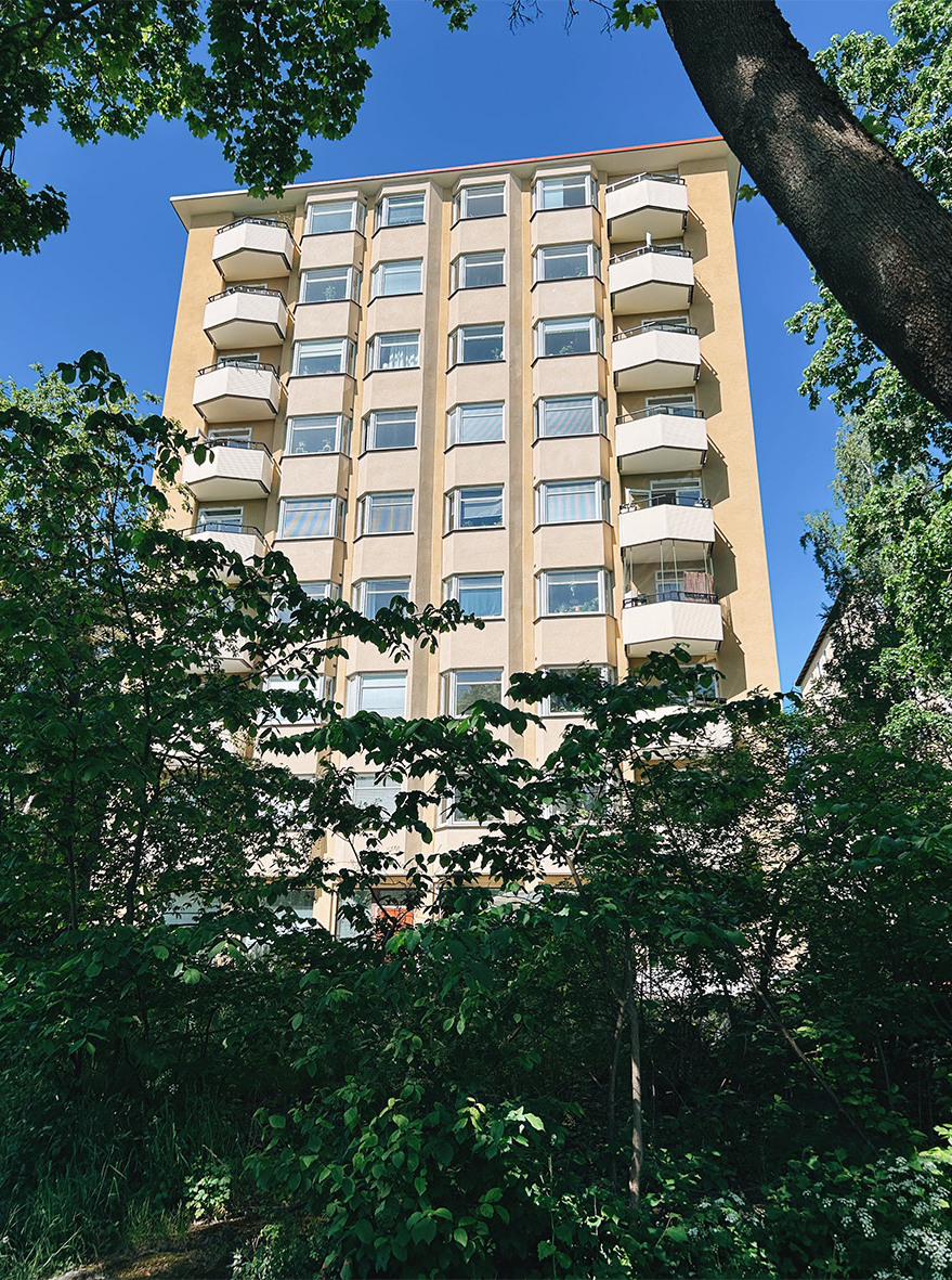 Ett K-märkt punkthus i Årsta med 32 lägenheter. Byggt 1947 och ritat av arkitekt Carl-Axel Acking och Sven Hesselgren. Bra läge nära tunnelbana, tvärbana och busslinjer.