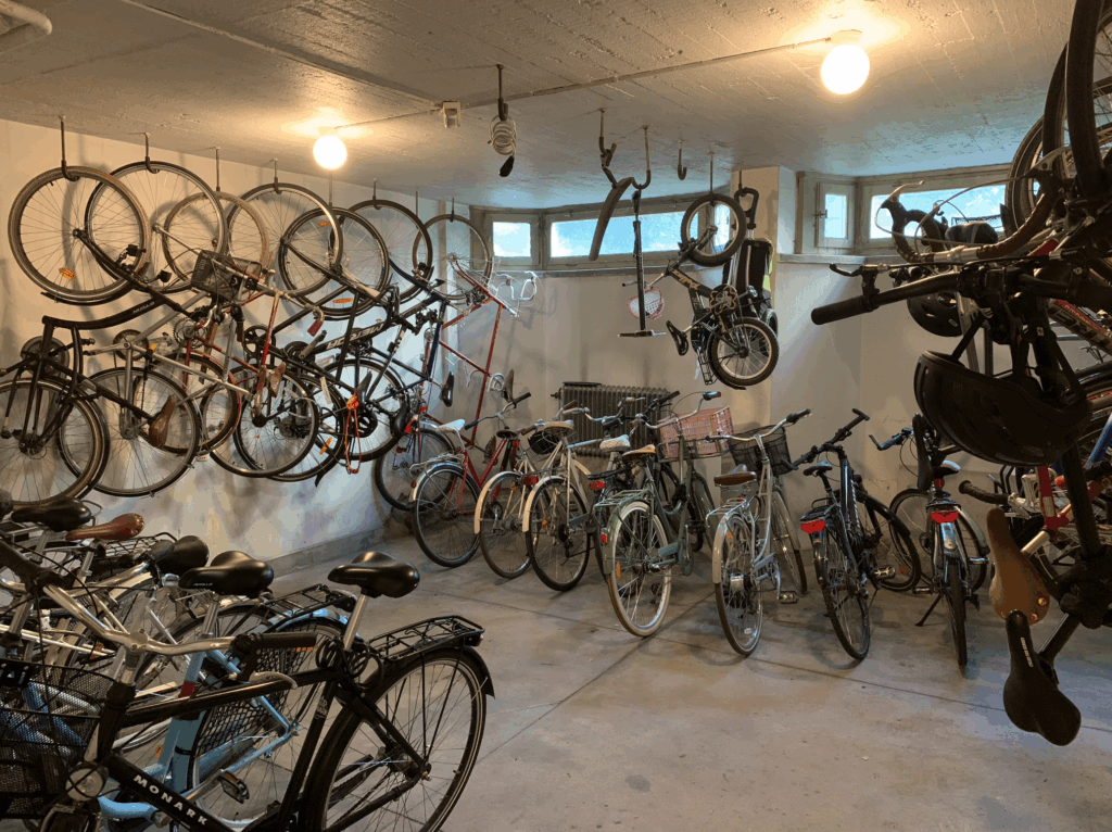 Saknar du din cykel? Hade du tagit bort märkningen kan den ha flyttats till det andra cykelrummet. Övriga cyklar har flyttats ned till skyddsrummet, eller hängts upp på krokar för att göra plats och förenkla vardagscyklandet.